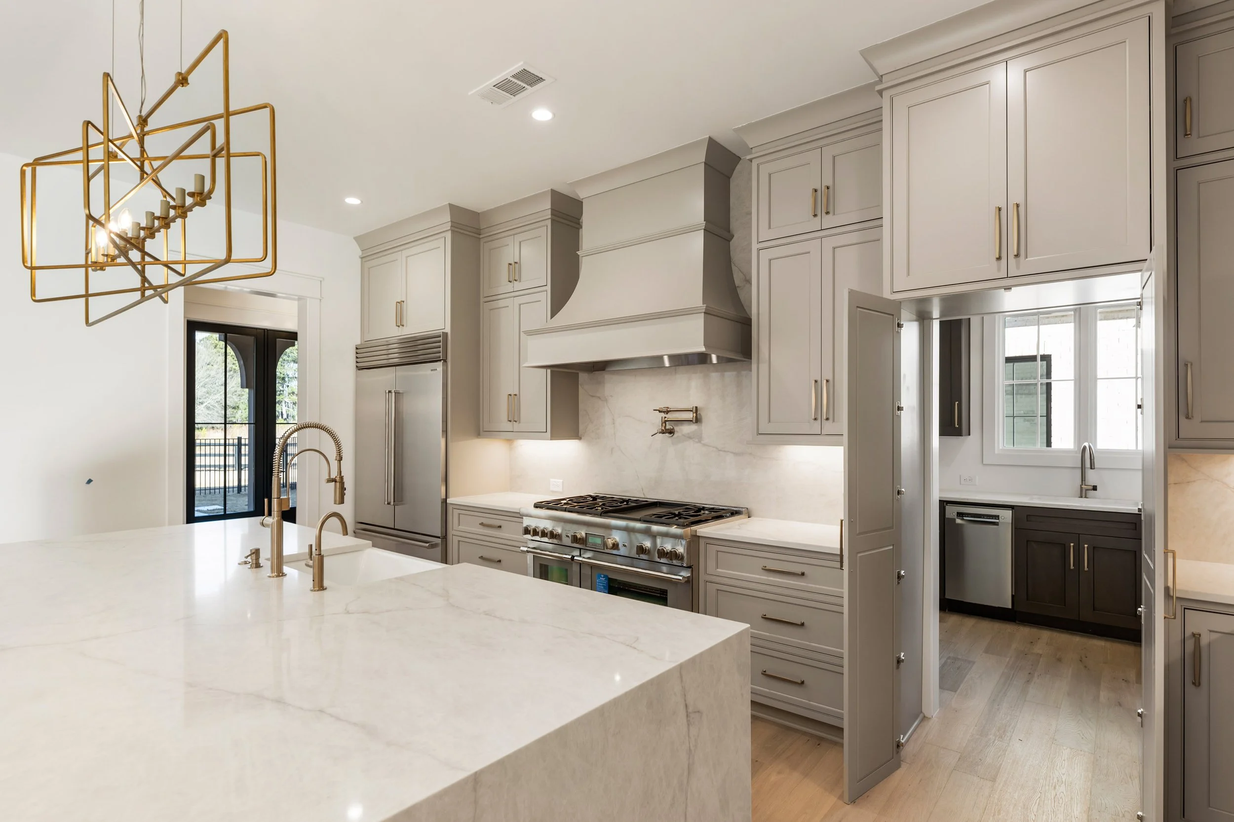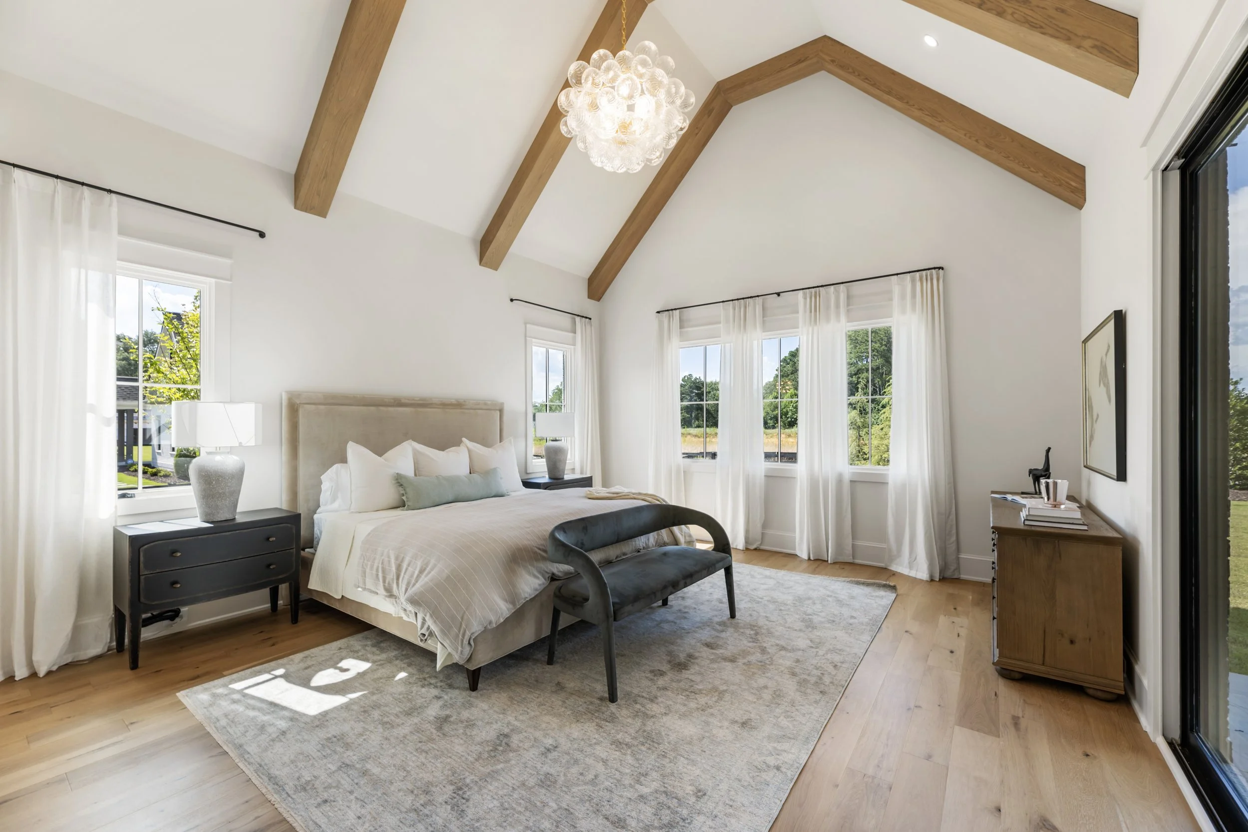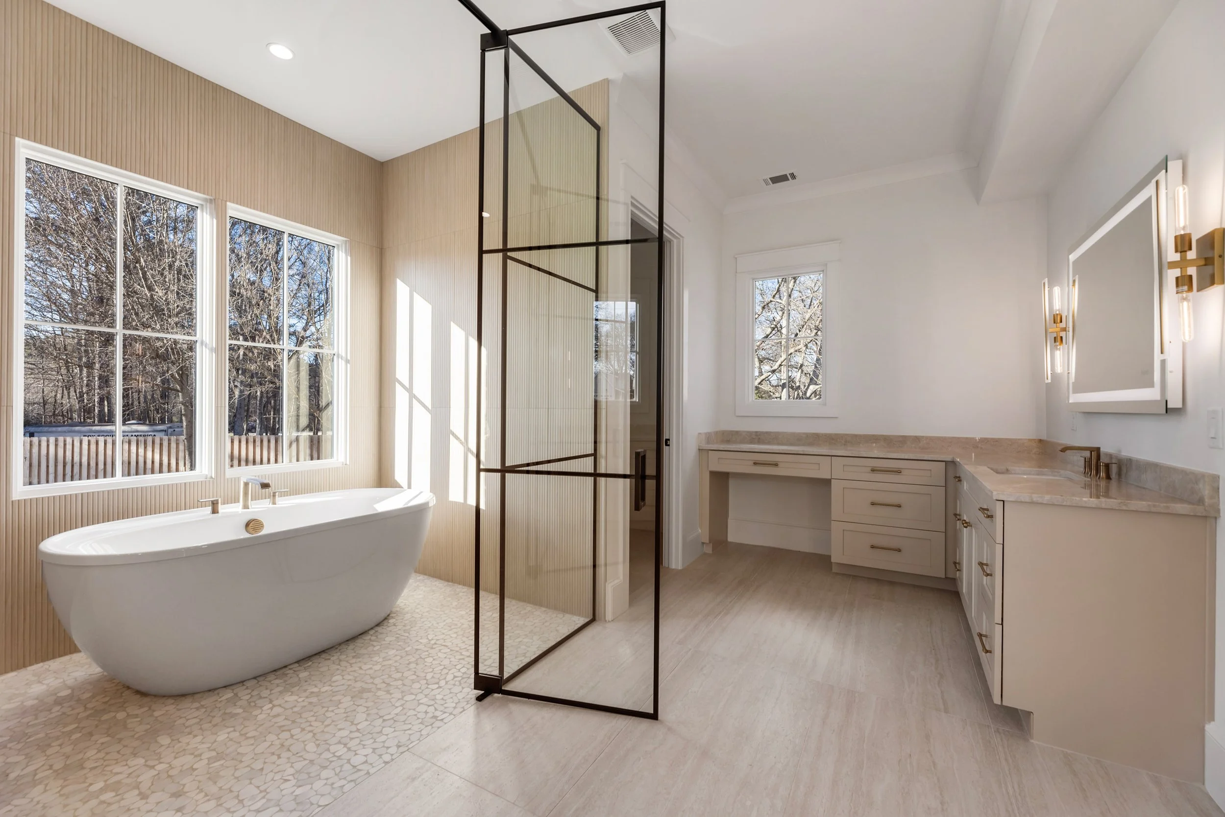 • Luxurious primary baths with Moen Voss fixtures, designer tile, framed mirrors, and custom built closets